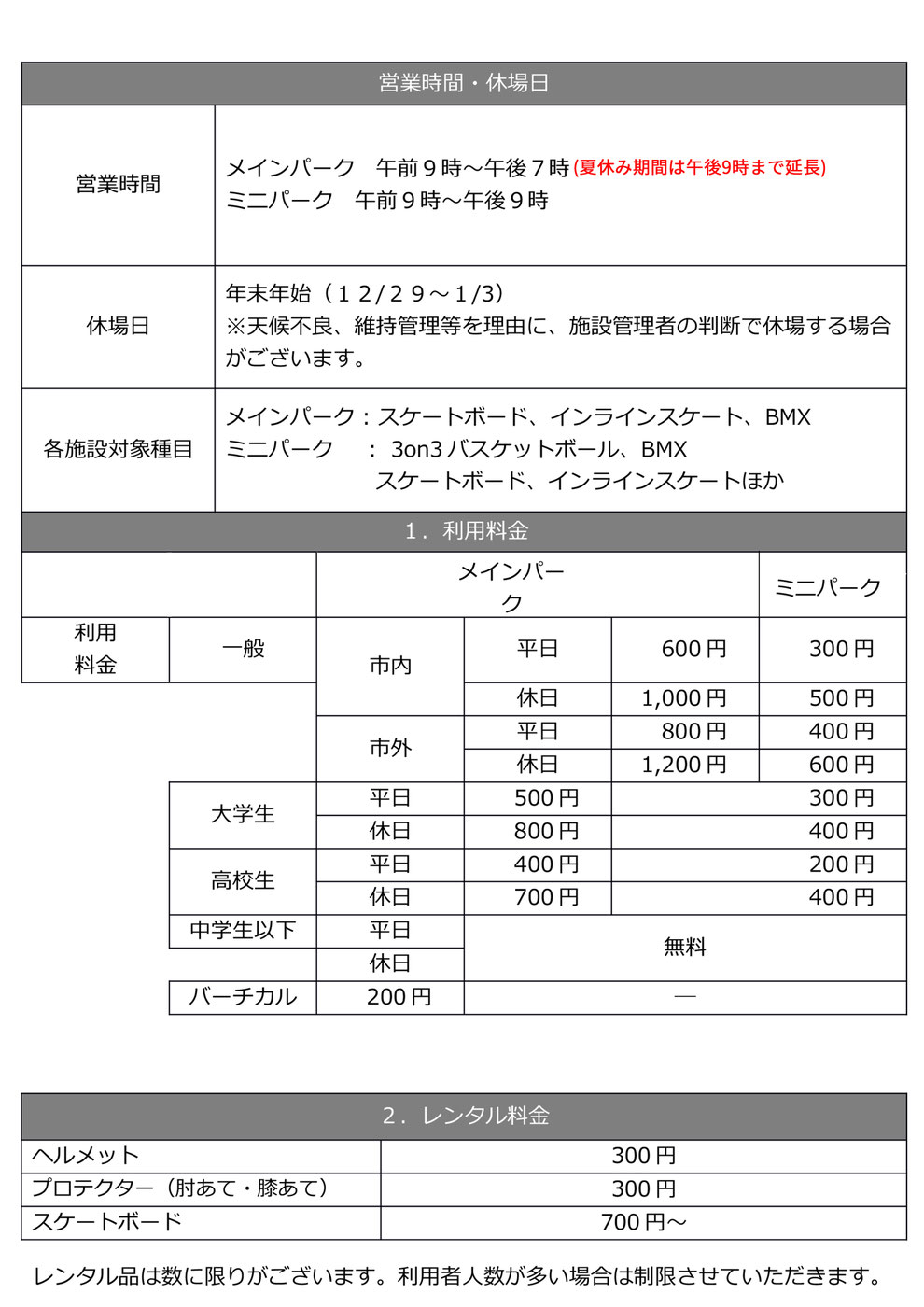 本日宝ヶ池から正式な営業時間、使用料金、レンタル代などが発表になりました。
